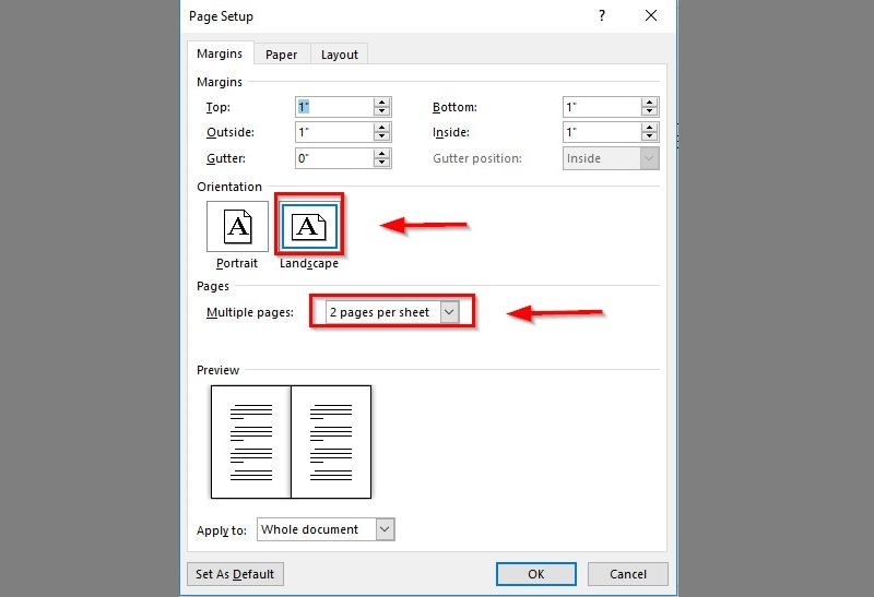 – Bước 2: Vào File -> Print -> chọn Page Setup -> trong thẻ Margins ở phần Multiple pages, bạn bấm mũi tên xổ xuống và chọn 2 Pages per sheet -> OK