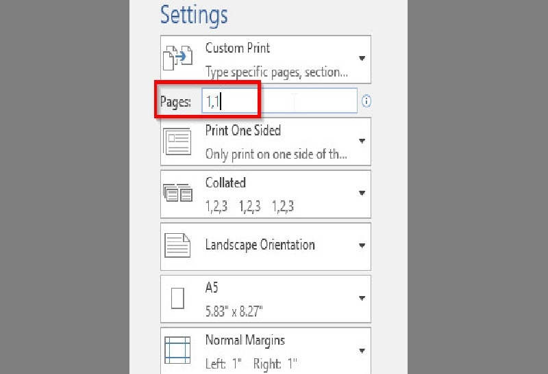– Bước 3: Ở mục Pages điền 1,1 để in hai trang A5 trên một tờ A4